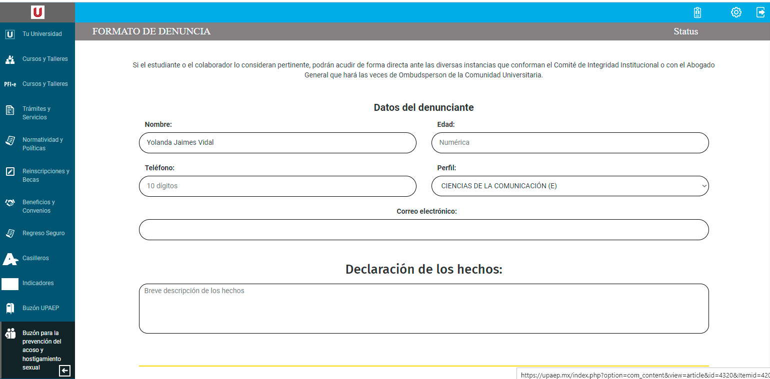 Al dar clic a la opción “Buzón para la prevención del acoso y hostigamiento sexual”, se desplegará un formato en el centro de la pantalla, el cuál deberás llenar con la información que allí se te pide, desde nombre completo, datos de contacto, declarar los hechos de la situación de acoso u hostigamiento del que has sido víctima y finalmente una serie de preguntas que tienen que ver con el agresor o agresora.