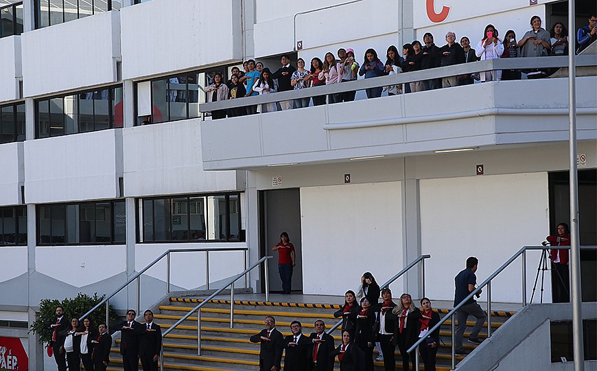La bandera fue portada por grupos estudiantiles de la universidad, para posteriormente ser izada por el Dr. Emilio José Baños, Rector de la universidad; mientras que quien dirigió el Juramento a la bandera fue el alumno Rodrigo Fernández de la Torre.